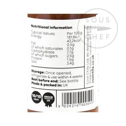 Zutaten: fermentiert Soybean Paste (Wasser, Soybeans, Reis, Salz, Alkohol), Wasser, Zucker, Chilipulver(7,3%), Sonnenblumenöl, Tomatenpüree, Zwiebel, Essig, Knoblauch, Salz.