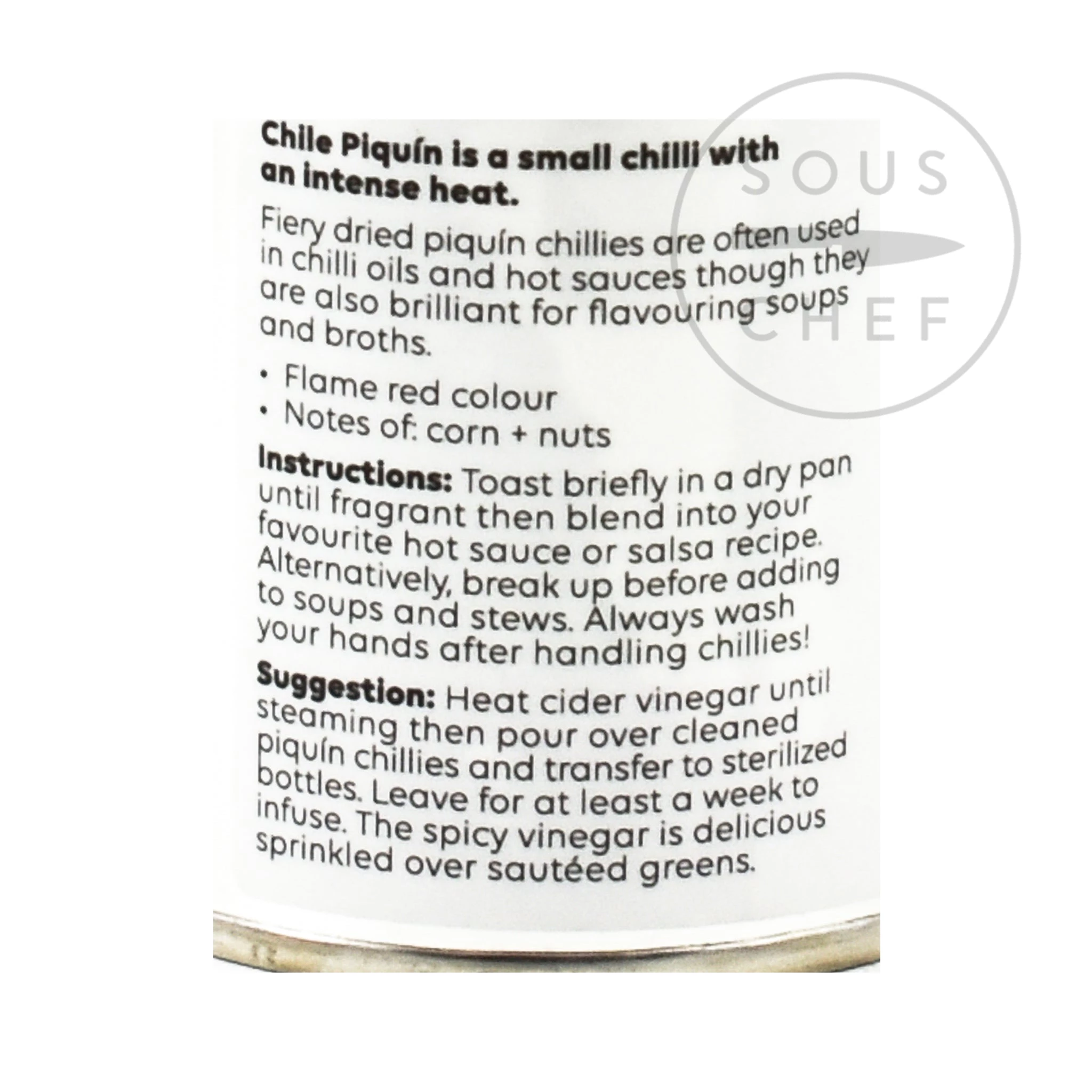 Piquin Chilis sind winzige, rote, mexikanische Chilis, die eine feurige Hitze zu den Gerichten bringen. Einer der kleinsten Chilis, sind Piquin Chilis weniger als einen Zoll lang – aber sind etwa zwanzigmal heißer als Jalapeño mit 100.000 bis 140.000 auf dem ScovilDie Chillis haben eine Zitrusgewürzigkeit und bittere Schokoladenoten. Sie geben der Tomatensauce und den roten Fleischmarinaden Hitze und Tiefe – ihre Größe und Stärke machen sie auch zu einer guten Zutat für die Eingießung von Ölen und Essigen.*p>