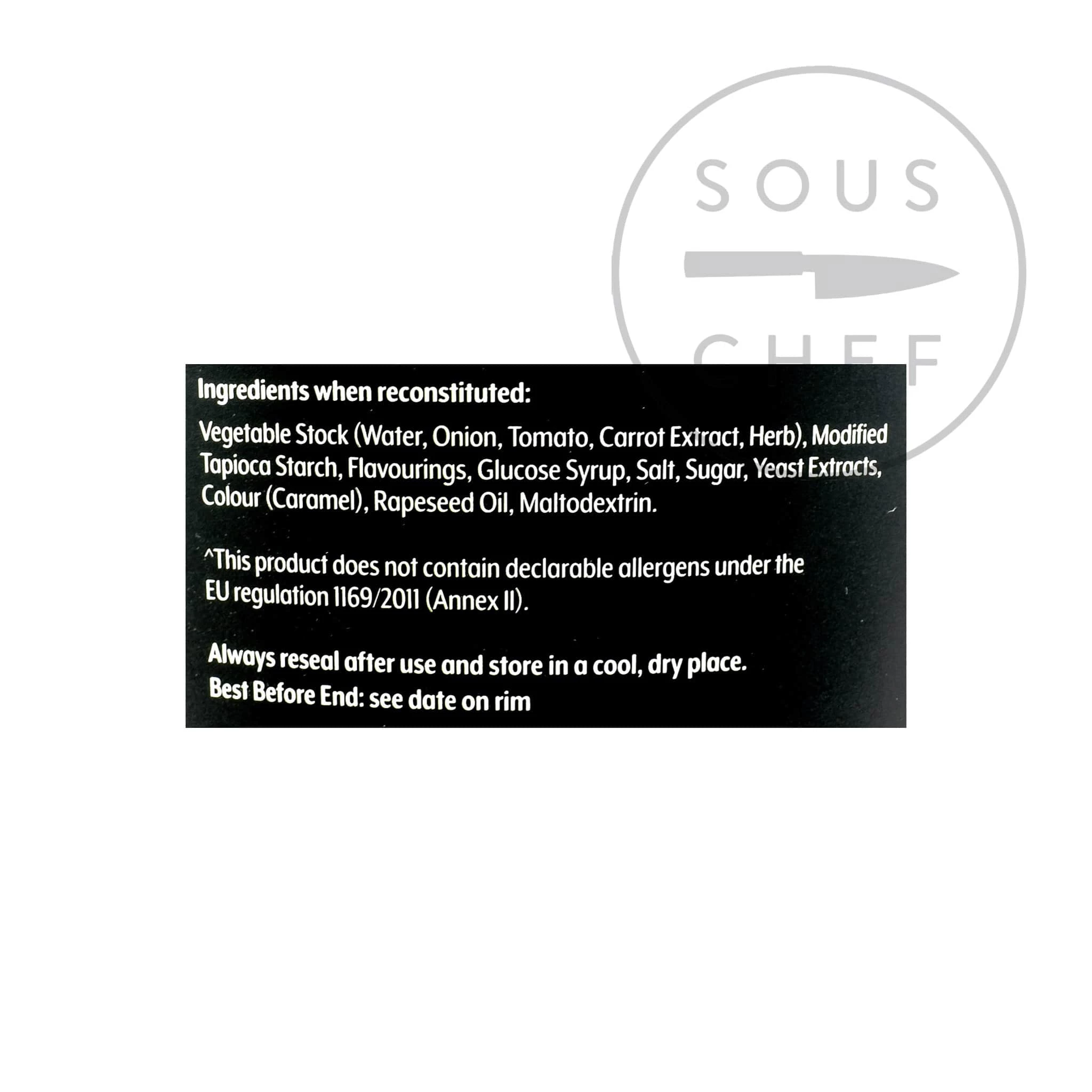Zutaten: Gemüsebestand (Wasser, Zwiebel, Tomaten, Karottenextrakt, Kräuter), modifizierte Tapiokastärke, Aromen, Glukosesirup, Hefeextrakte, Colour (Caramel) Rapsöl, Maltodextrin.
