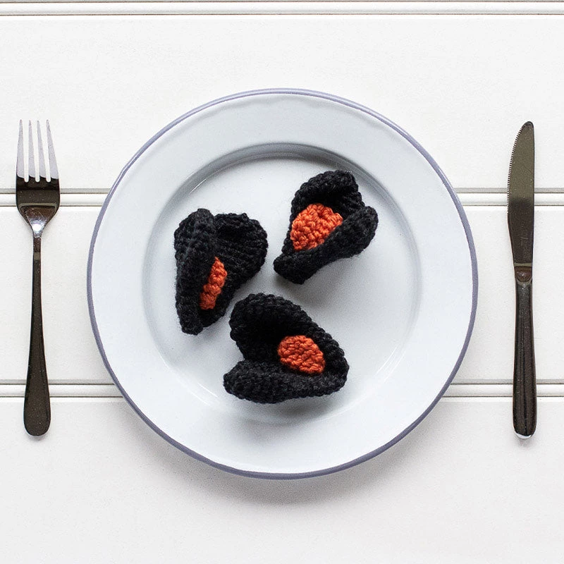 Toftmuscheln in einem Zinn Gourmet Häkelkit ist ein kunstvolles Geschenk für Muschelliebhaber. Jede Dose kommt mit Garn und einem einfach zu folgenden Muster für die Herstellung 8 niedlich gehäkelt mussels.