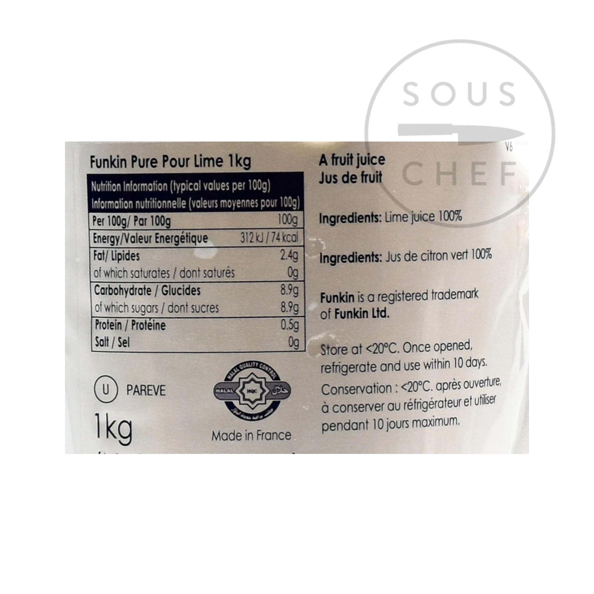 Dieser natürliche Limettensaft, auch bekannt als Limettenpüree oder pure pour Limette, ist eine vielseitige Zutat in der Cocktailherstellung. Versuchen Sie, Limettensaft, um einen klassischen Mojito, Daiquiri, Singapore Sling oder Margarita zu machen. Limettensaft ist auch eine nützliche Zutat in Pâtisserie recipes such as key lime pie and lime jelly.
