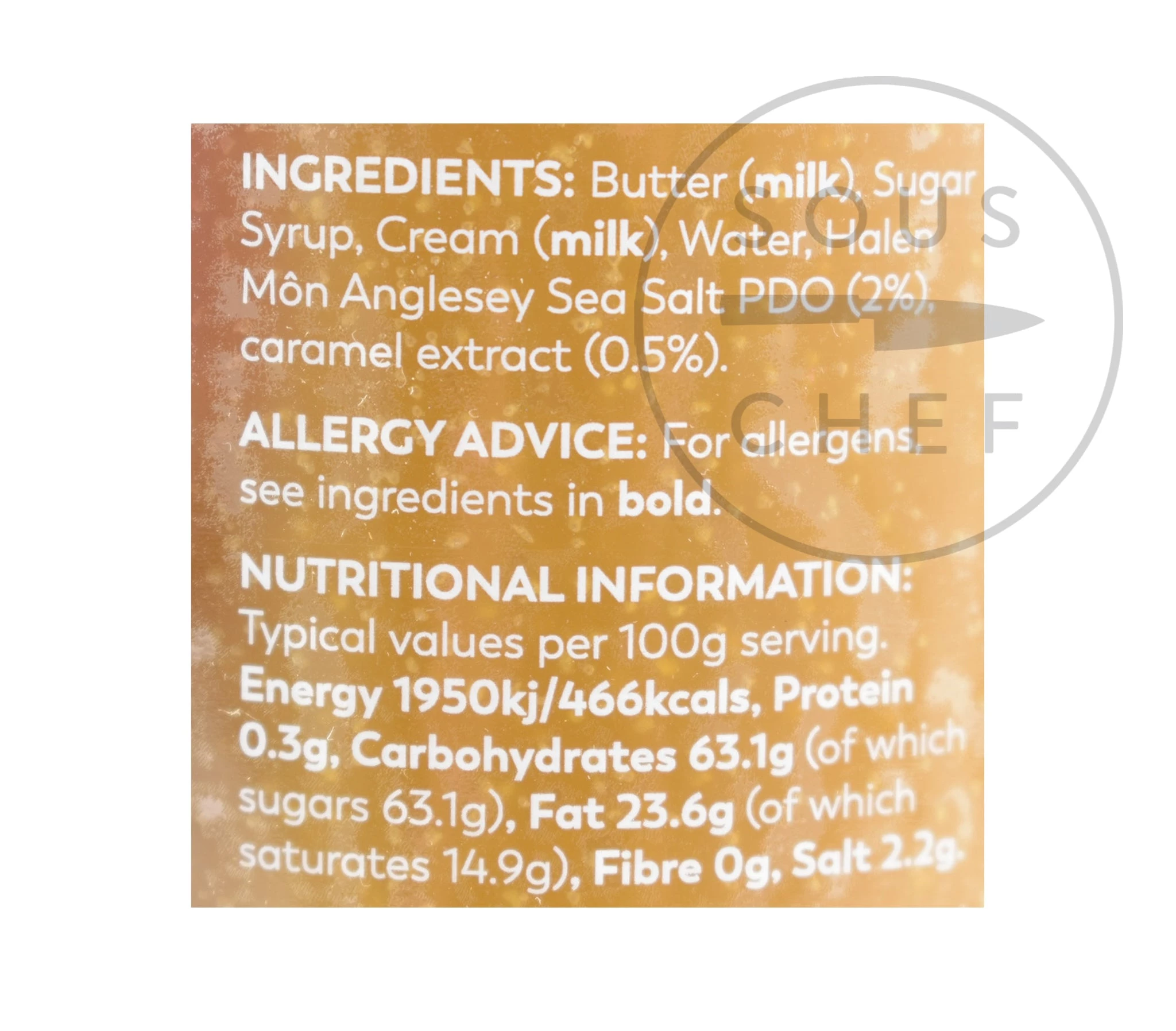 Inhaltsstoffe: Butter (Milch), Zuckersirup, Sahne ( Milch ), Wasser, Halen Môn Anglesey Meersalz PDO (2%), Karamellextrakt (0,5%)