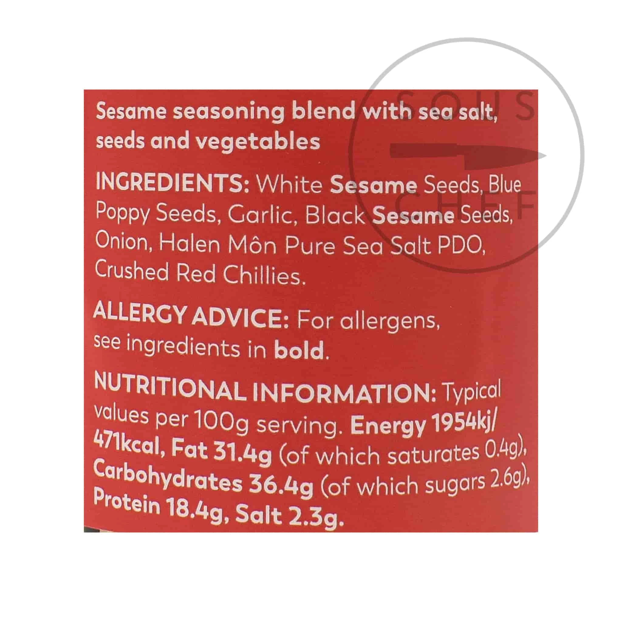 Inhaltsstoffe: weiß Sesam Samen, blaue Mohnsamen, Knoblauch schwarze Sesamsamen, Zwiebeln, Halen mon sea salt g.U., zerkleinerte rote Chilis.