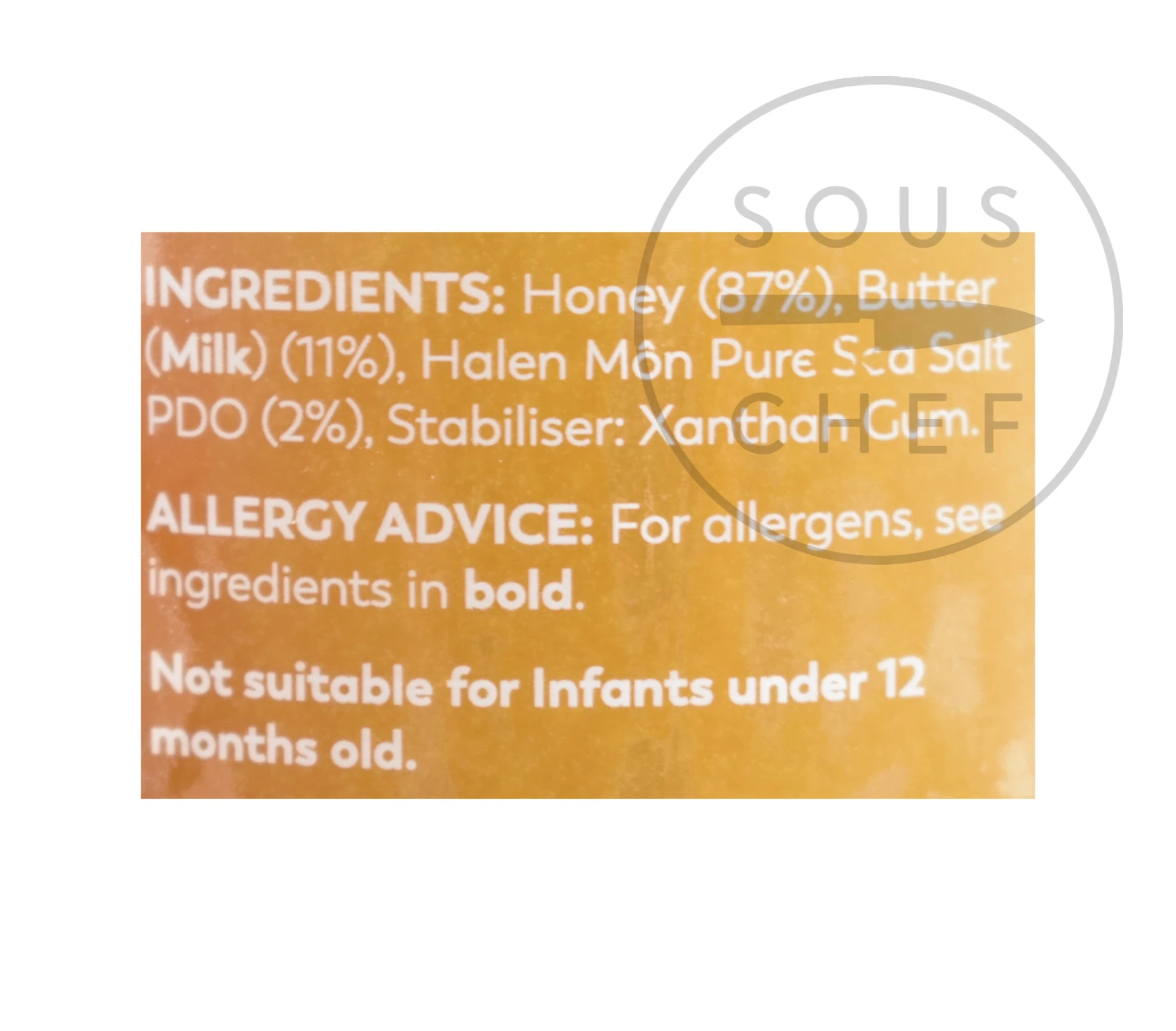 Inhaltsstoffe: Honig (87%), Butter (Milch ) (11%), Halen Môn Pure Sea Salt g.U. (2%), Stabilisator: Xanthan-Gummi.