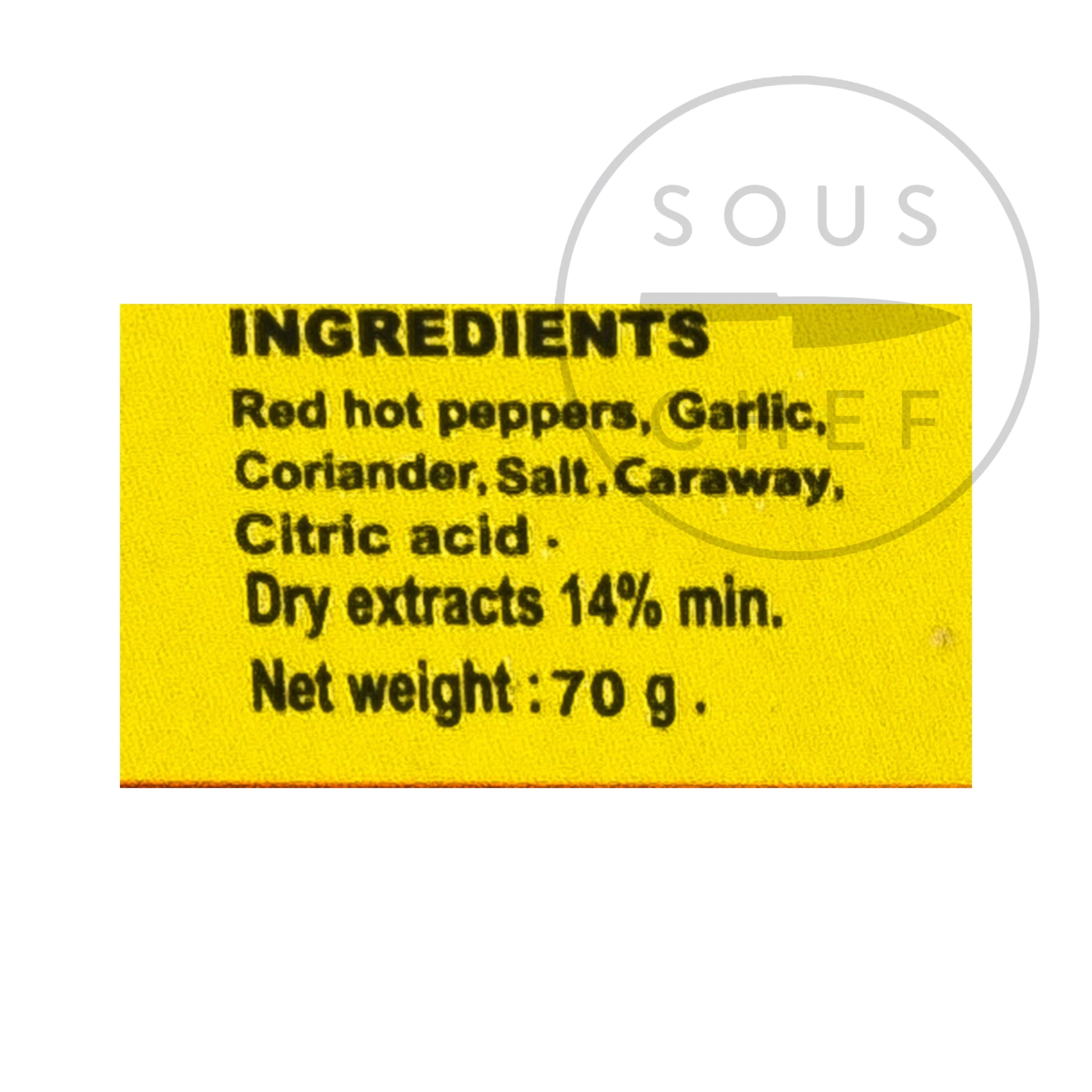 Inhaltsstoffe: Roter Paprika (87%), Knoblauch, Koriander, Salz, Kümmel, Säuerung: E330. Trockenextrakte: 14% mindestens. Glutenfrei.<