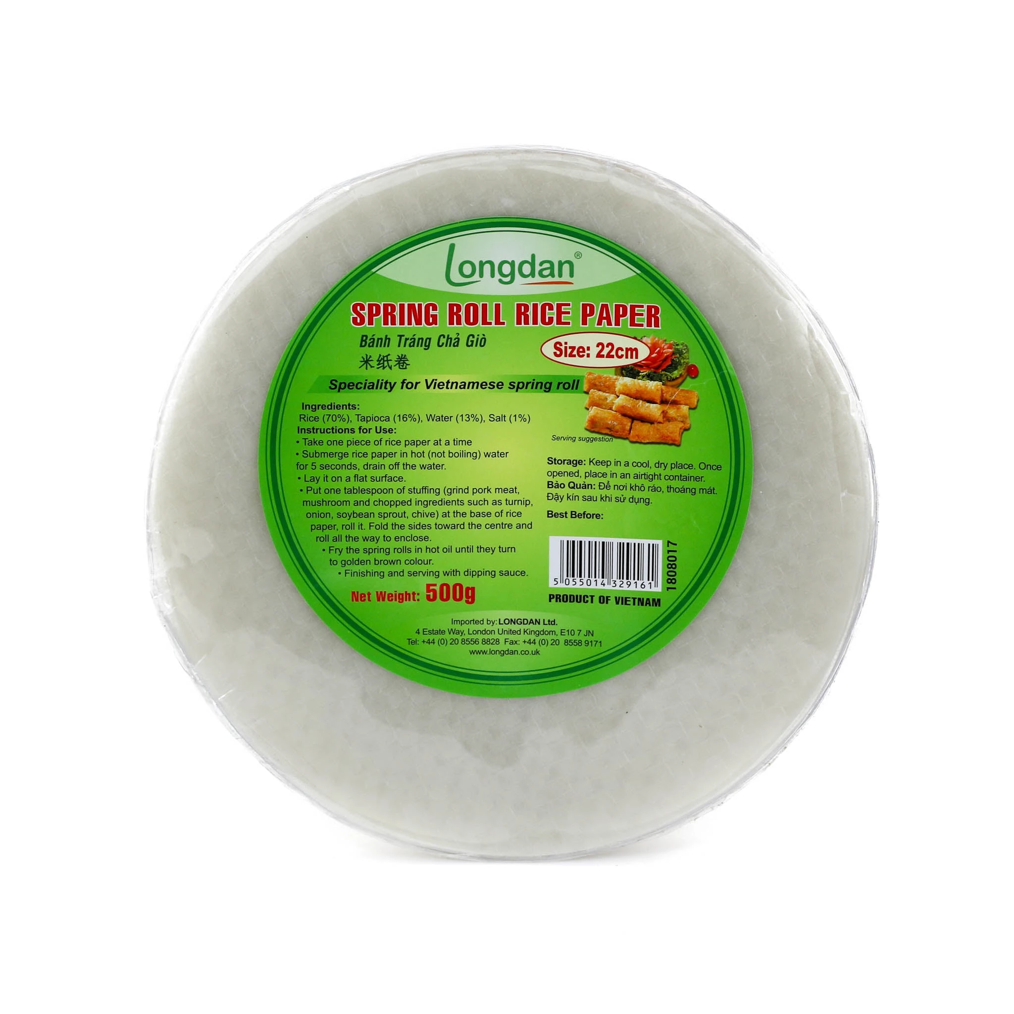 Verwenden Sie vietnamesische Frühlingsrolle Reispapier, um knusprige frittierte Frühlingsrollen zu machen. Mit einer Größe von 22cm oder 28cm können diese großen Reispapierblätter mit fein geschnittenem Gemüse, saftigen Garnelen oder gemahlenem Schweinefleisch gefüllt werden, bevor sie in gefaltet werden.zu einem ordentlichen Päckchen und frittiert.
