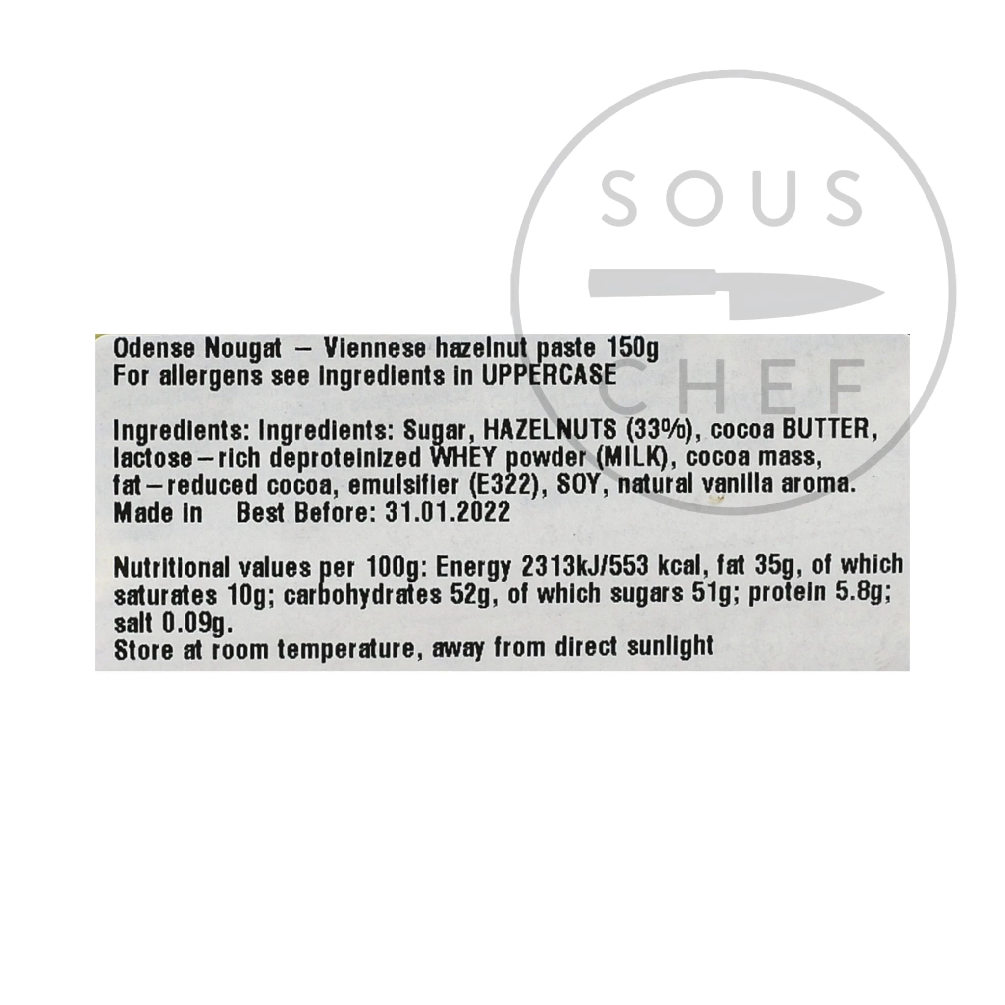 Odense Nougat ist ein Block aus Wiener Haselnusspaste zum Backen und in Desserts. Es ist eine klassische Zutat in vielen skandinavischen Rezepten,z.B. traditionelle Haferquadrate mit einem Quadrat des Nougats.