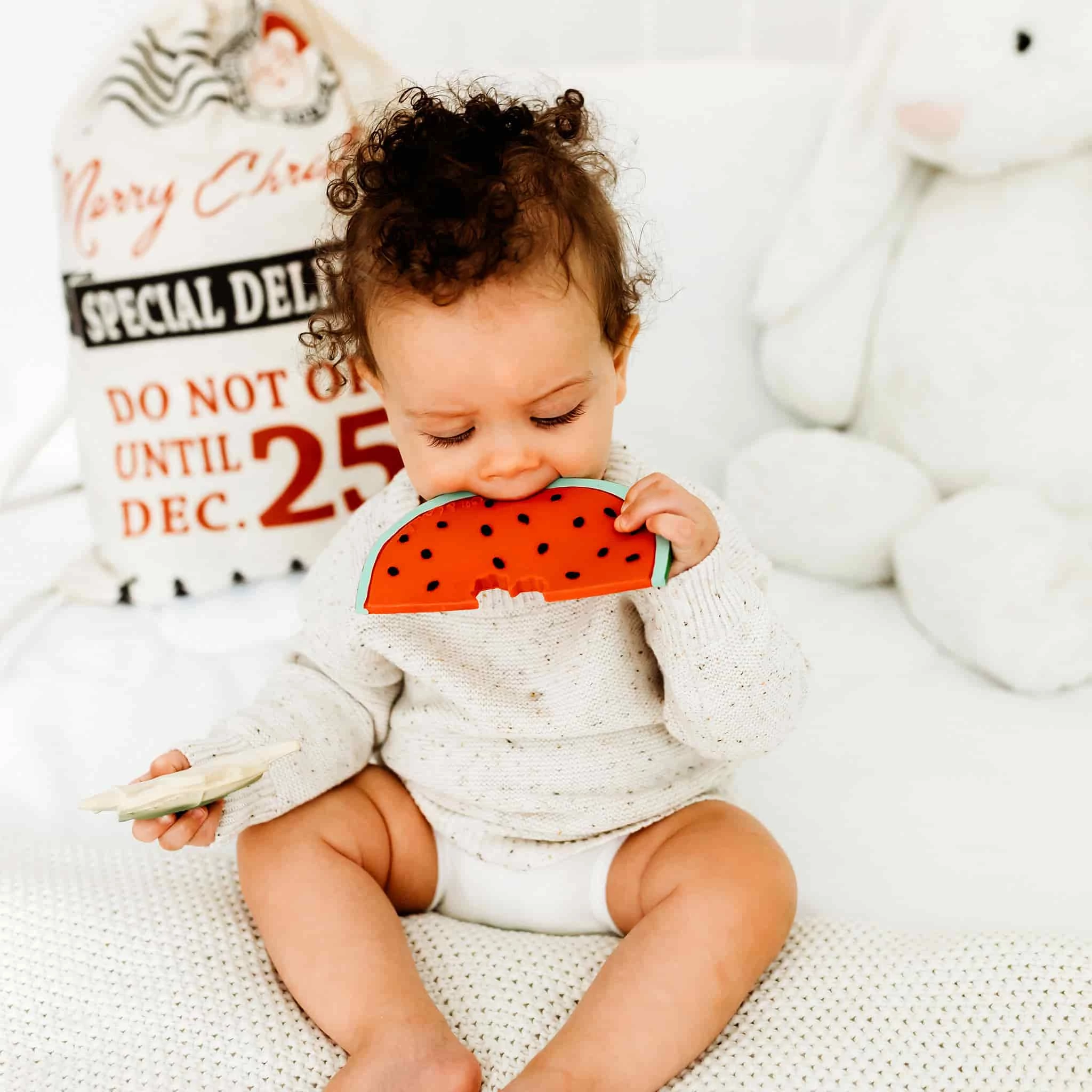 Die Wally die Wassermelone Baby Beißspielzeug fügt einen Hauch von tropischer Niedlichkeit, wie es hilft Ihrem Kind durch die Beißphase. Das Stückchen Spielzeug ist leicht für kleine Hände zu halten, und ist ideal für Zähne, Sinnesspiel und Badezeiten.