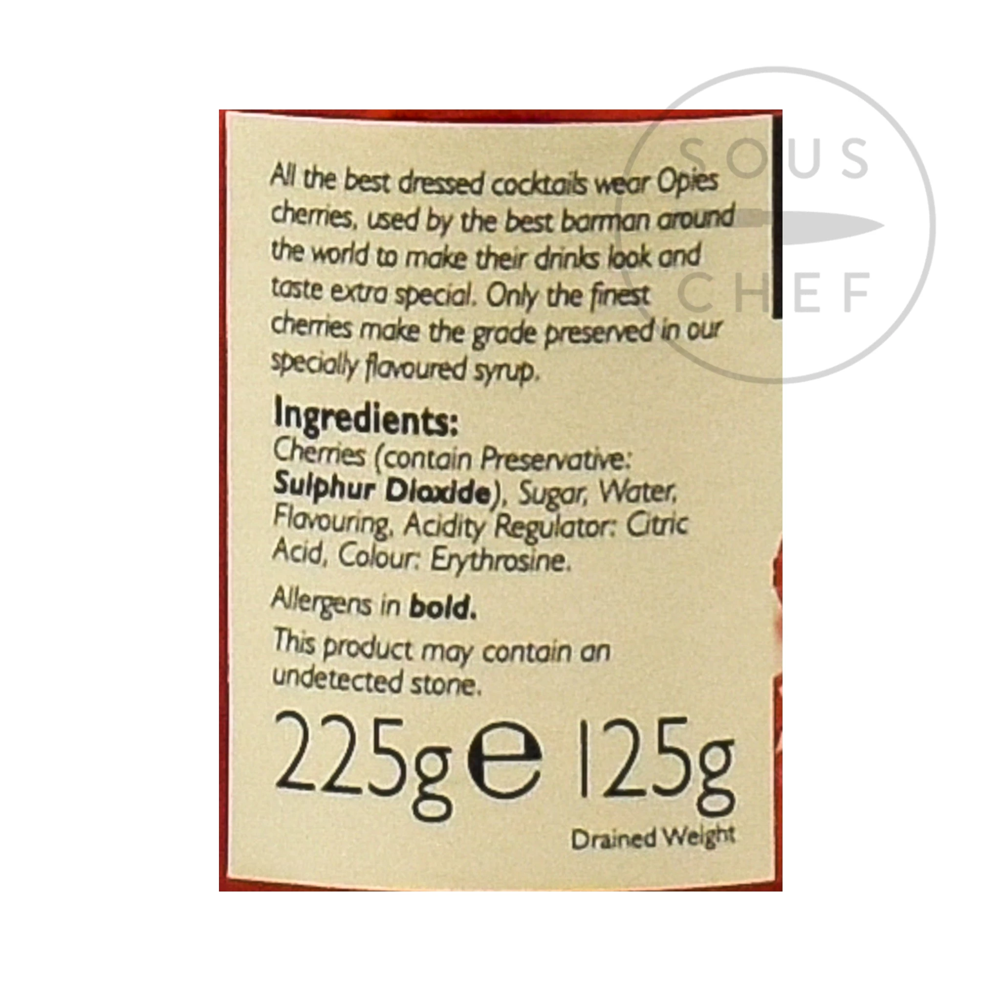 Ingredients: Kirschen, Zucker, Wasser, Zitronensäure, Aroma, Farbe E127, Konservierungsmittel E221. Enthält Schwefeldioxid.