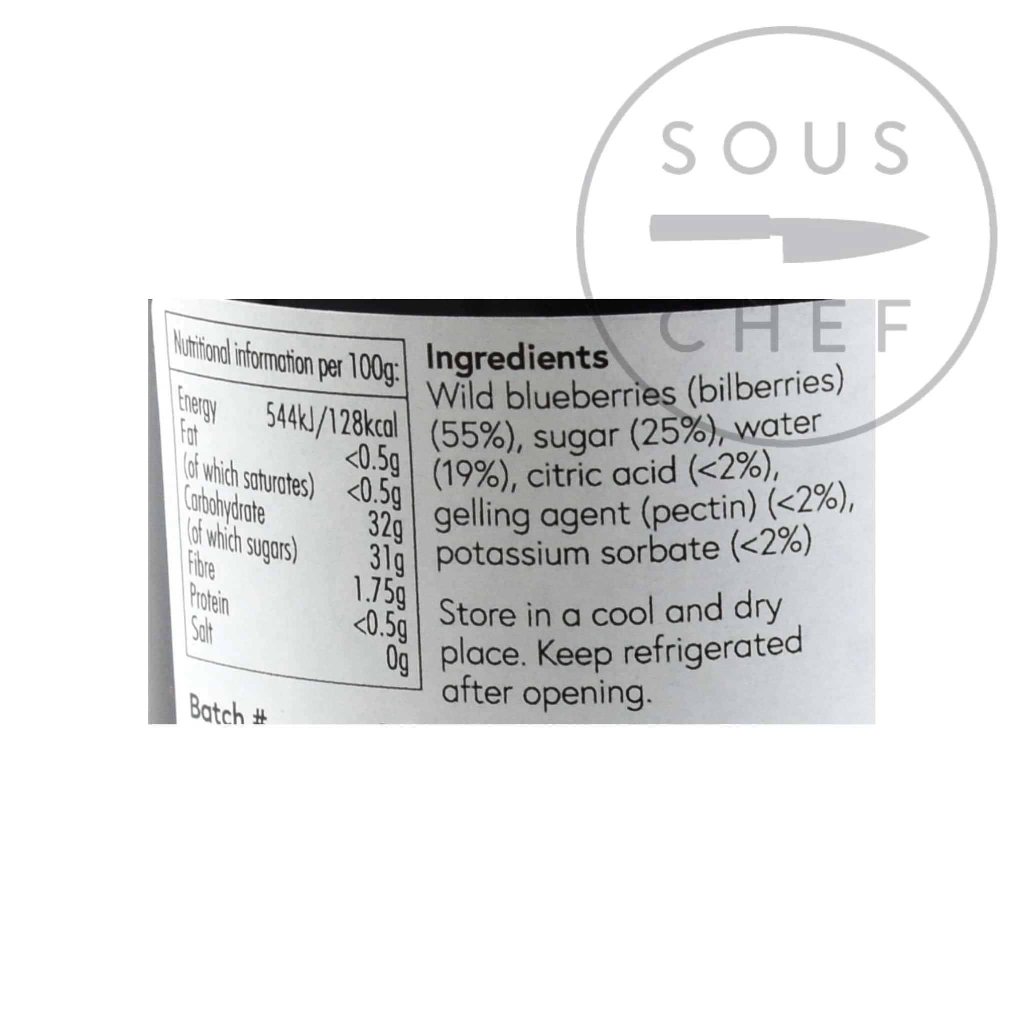 Zutaten: Wilde Heidelbeeren (Bibbeeren) (55%), Zucker (55%), Wasser (19%) Zitronensäure (<2%), Geliermittel (Pektin) <2%, Kaliumsorbat (<2%).