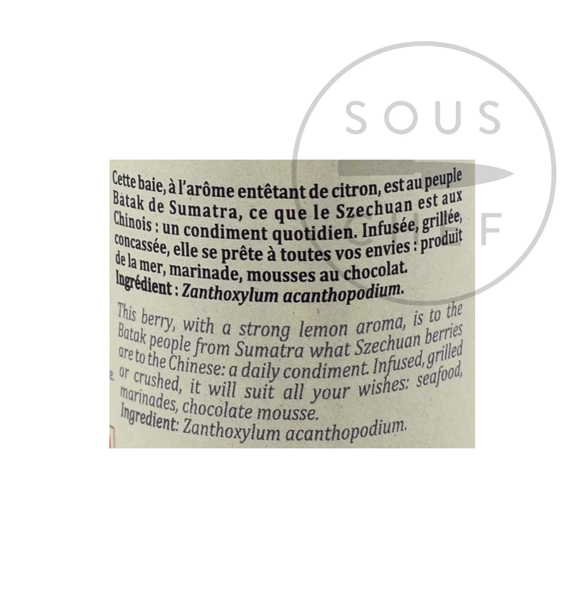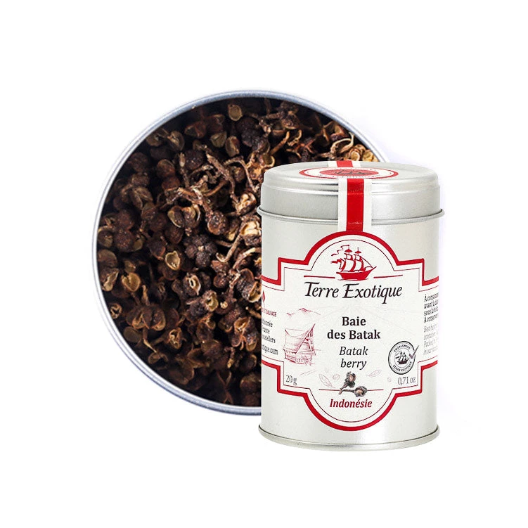 Terre Exotiques Batak-Beere hat berauschende Zitronenaromen – das Batak-Äquivalent der chinesischen Szechuan-Beere. Geerntet in Indonesien vom Batak-PeoDiese Beeren wachsen im zanthoxylum acanthopodium Bush und sind verwandt mit Szechuan Beeren. Auch bekannt als Bataks Pfeffer, diese Beeren werden in einem traditionellen Gericht von Ikan mas arsik, hergestellt mit Wok-Fritt-Carps und einer Ingwer- & Amp; Zitronengras-Sauce.