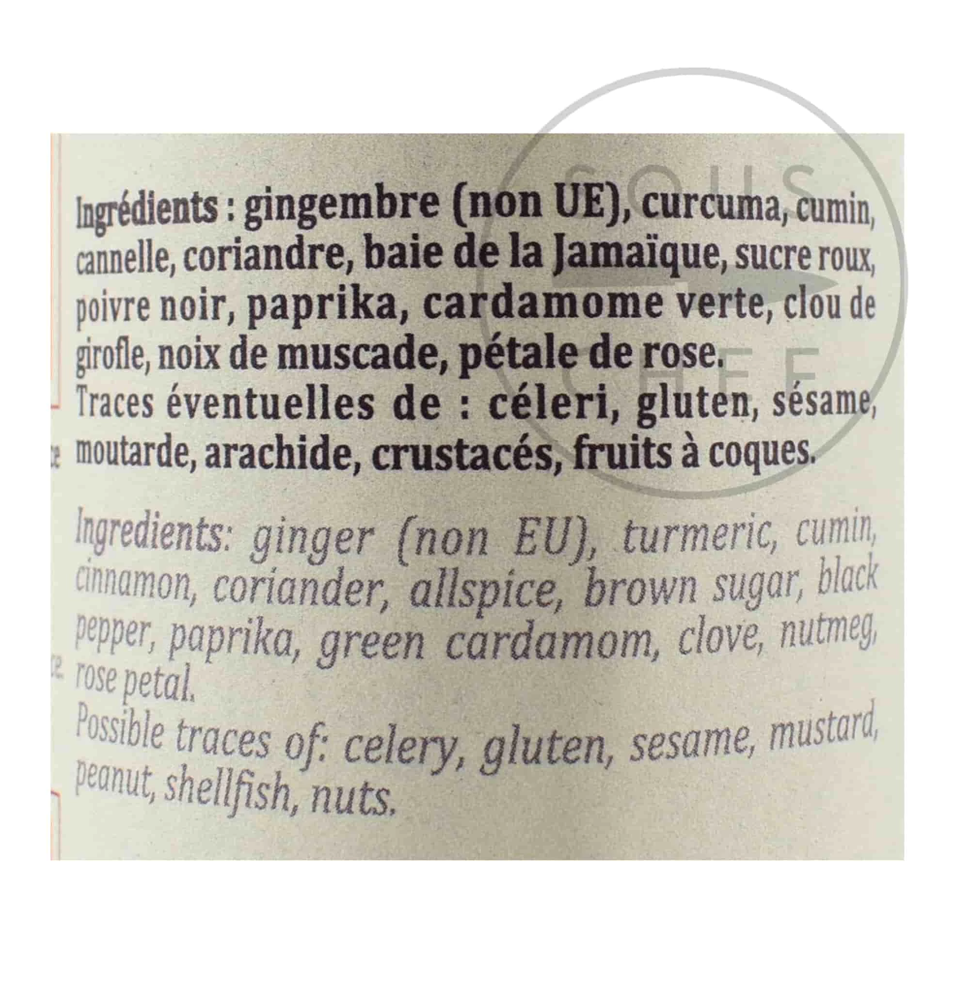 Inhaltsstoffe: Kurkuma, Koriander, Kreuzkümmel, schwarzer Pfeffer, Ingwer, Zimt, Nelke, grüne Kardamom, Allspice, brauner Zucker, Paprika, Muskatnuss, Rosenblüten.
