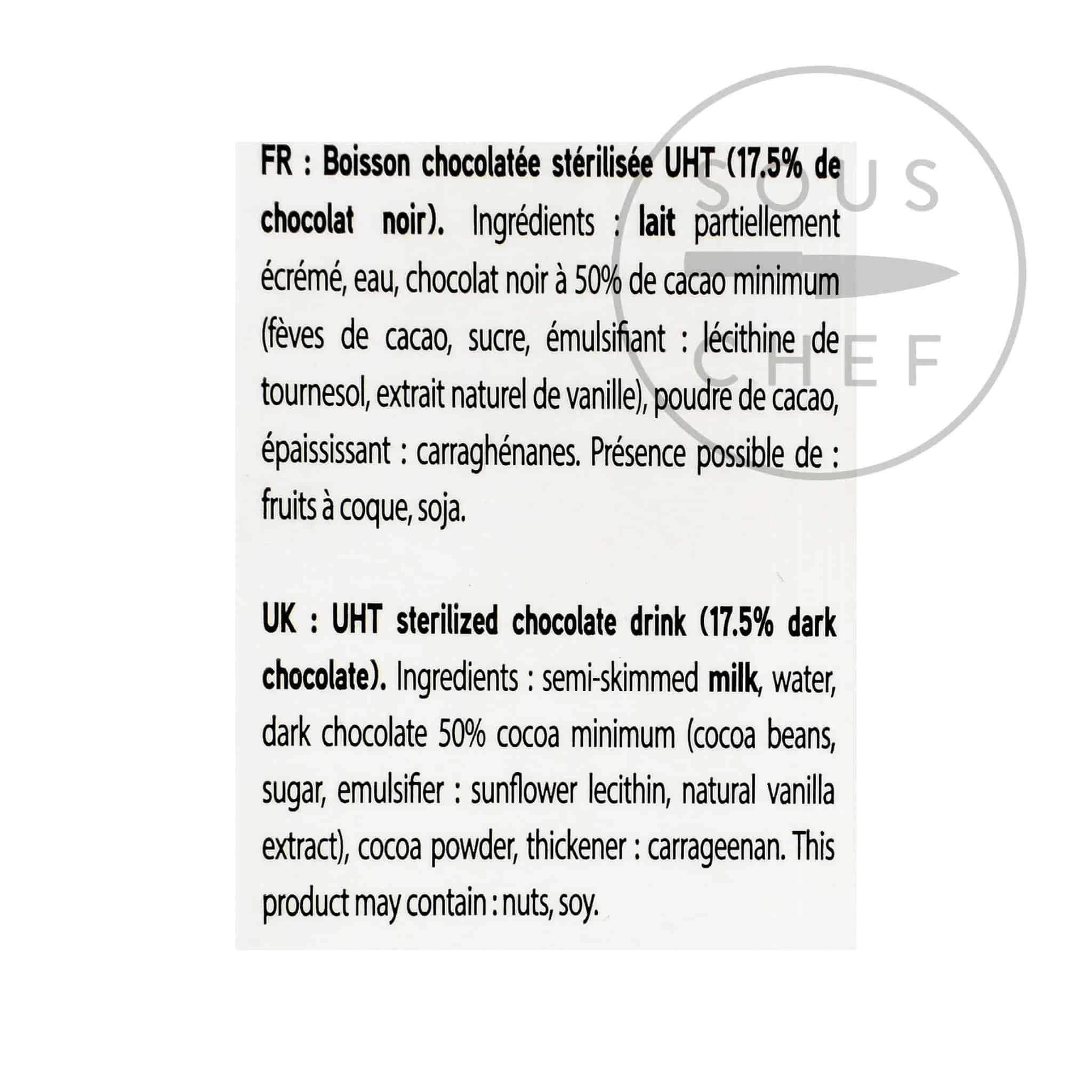 Zutaten: halbgekämmt Milch , Wasser, dunkle Schokolade 50% Kakao mindestens (Kokaobohnen, Zucker,Emulgator: Sonnenblumenlecithin, natürlicher Vanilleextrakt), Kakaopulver, Verdickungsmittel: Carrageenan. Kann Nüsse & Soja enthalten.