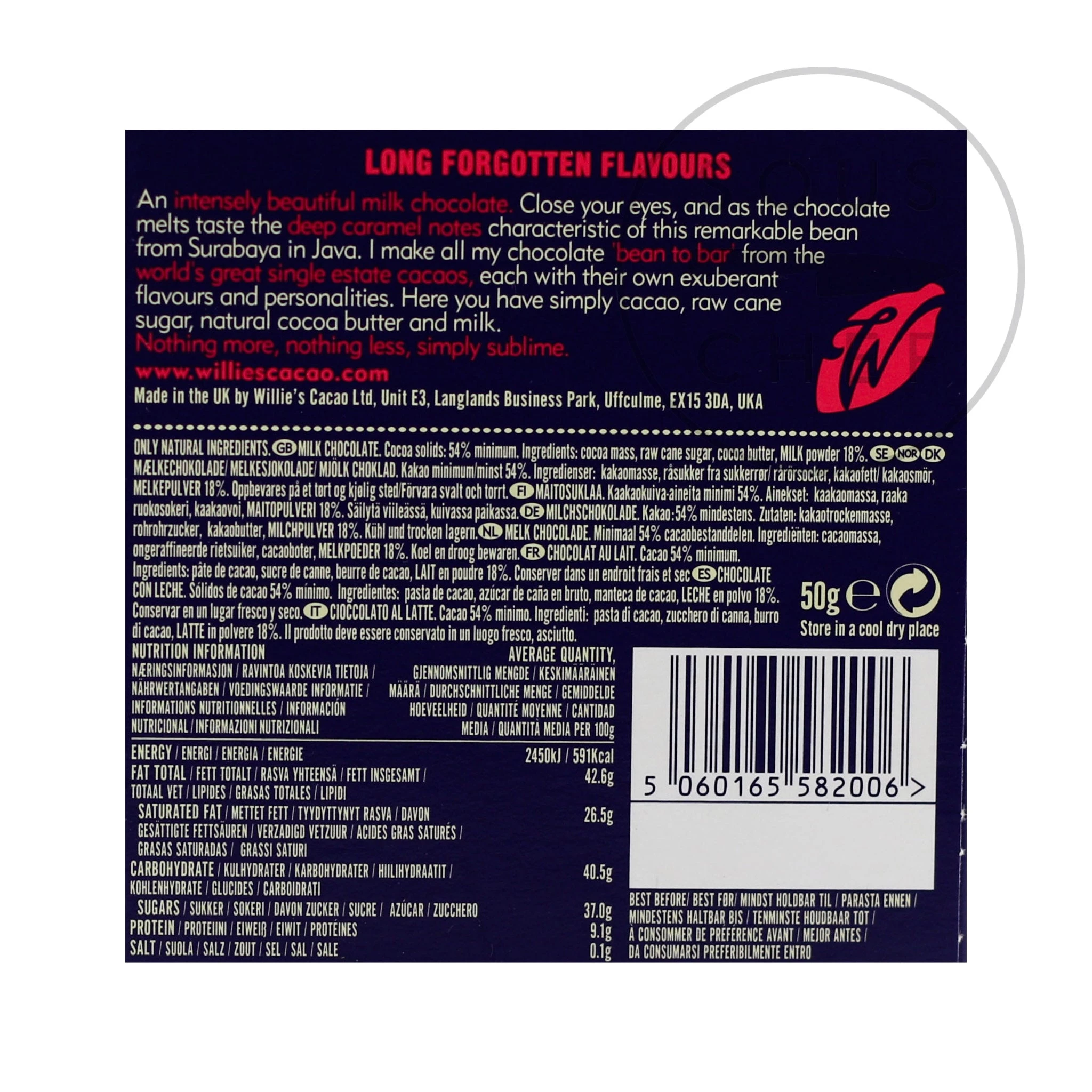 Willies Cacao Milk of the Stars 54% Milchschokoladeriegel ist alles über die weichen Karamellnoten. Hergestellt mit Bohnen aus Surabaya in Java (eine indonesische Insel), hat diese dunkle Milchschokoladeriegel die gleiche Menge an Zucker wie 70%dunkle Schokolade, plus ein wenig Milch.