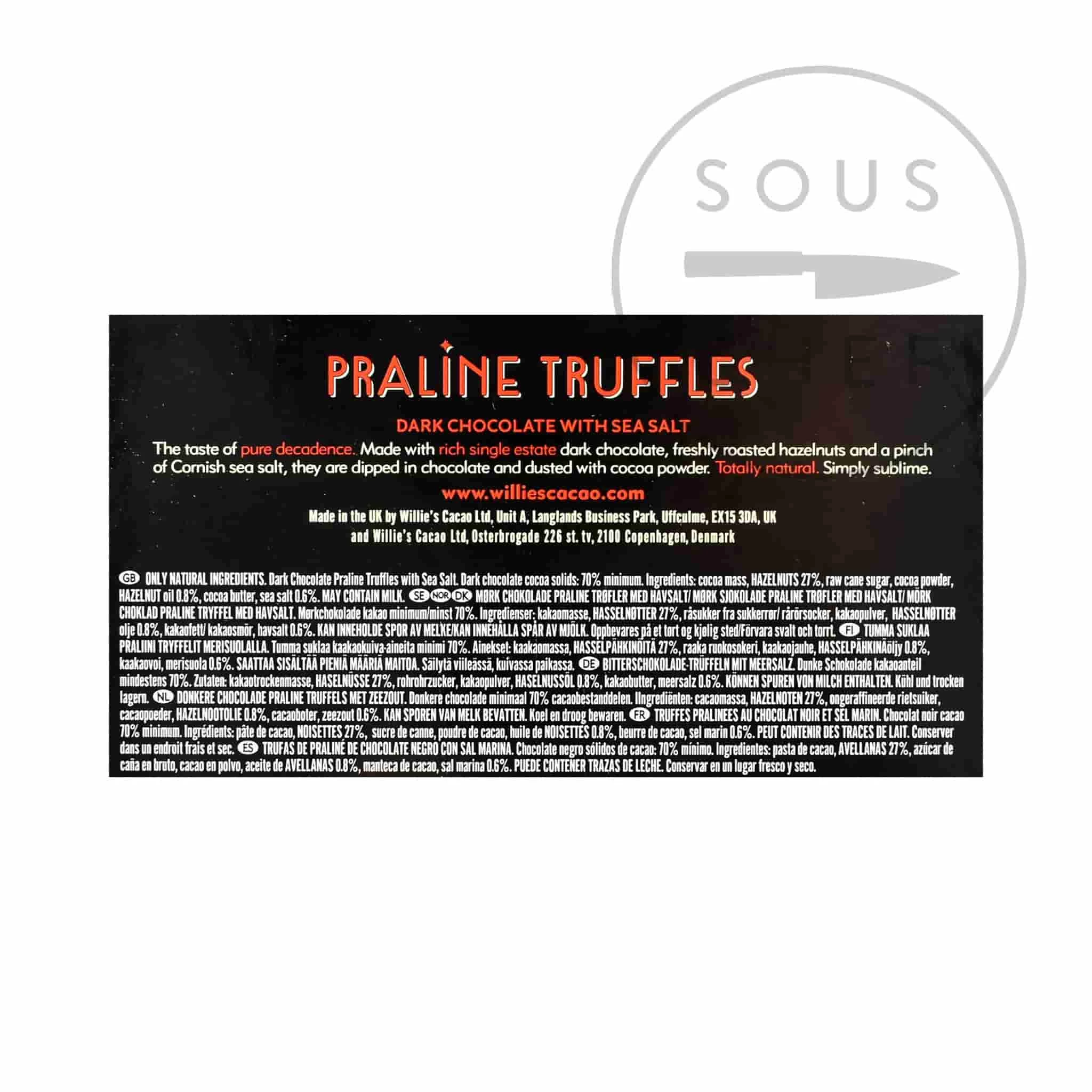 Willies Cacao dunkle Pralinentrüffel mit Meersalz sind perfekt für diejenigen, die ihre Schokolade reich und intensiv lieben.nd von Single Estate dunkle Schokolade, geröstete Haselnüsse und eine Prise Cornish Meersalz, sie sind mit einer glatten Beschichtung von extra Schokolade und Staubung von leicht bitteren Kakao.
