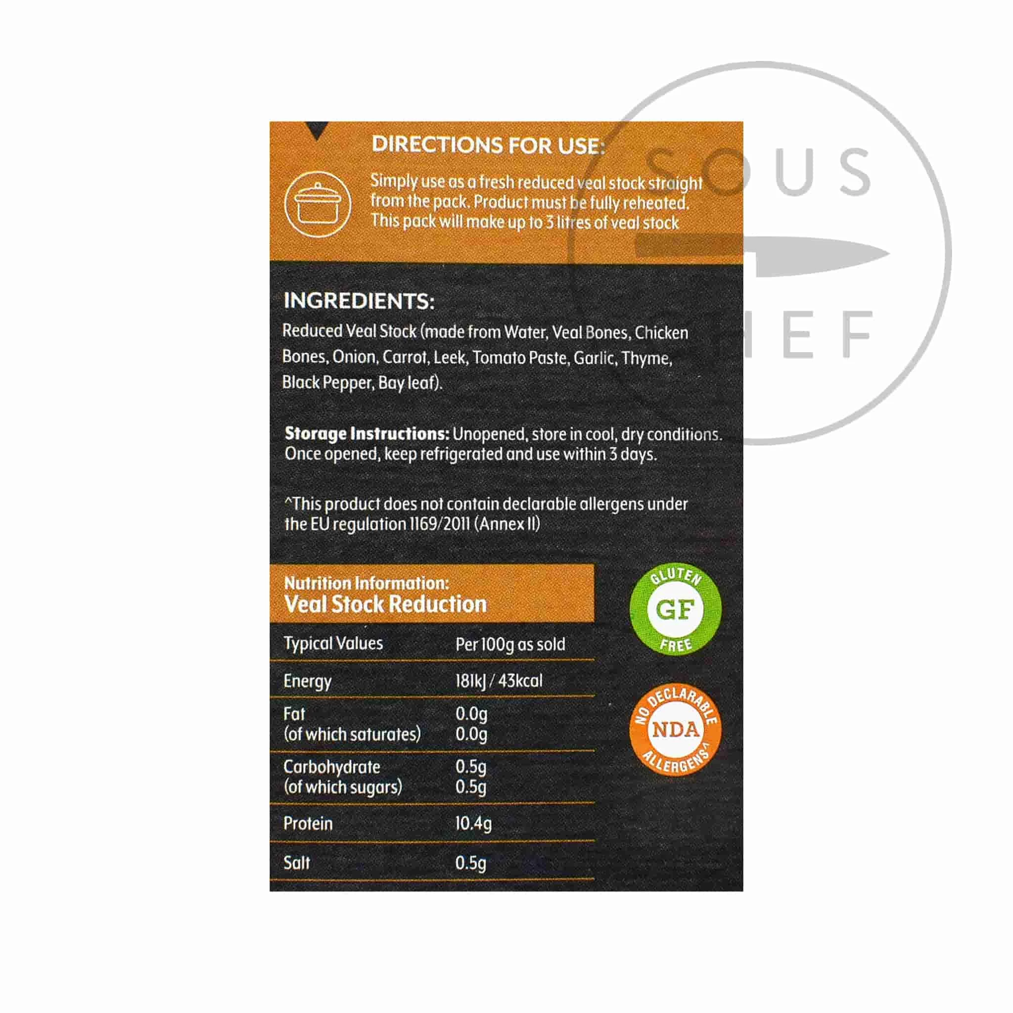 Zutaten: reduzierter Kalbsbestand (aus Wasser, Kalbsknochen, Hühnerknochen, Zwiebel, Karotte, Lauch, Tomatenpaste, Knoblauch, Thymian, schwarzer Pfeffer, b)ay leaf).